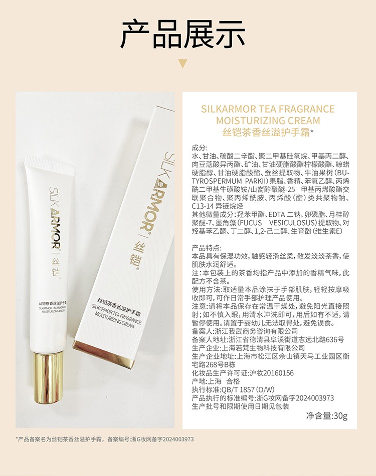 【备案编号】:浙G妆网备字2024003973 【产品特点】:本品具有保湿功效,触感轻滑丝柔,散发淡淡茶香,使肌肤水润舒适。 【使用方法】:取适量本品涂抹于手部肌肤,轻轻按摩吸收即可,可作日常手部护理产品使用。 【适合人群】:普通人群 【使用期限】:3年